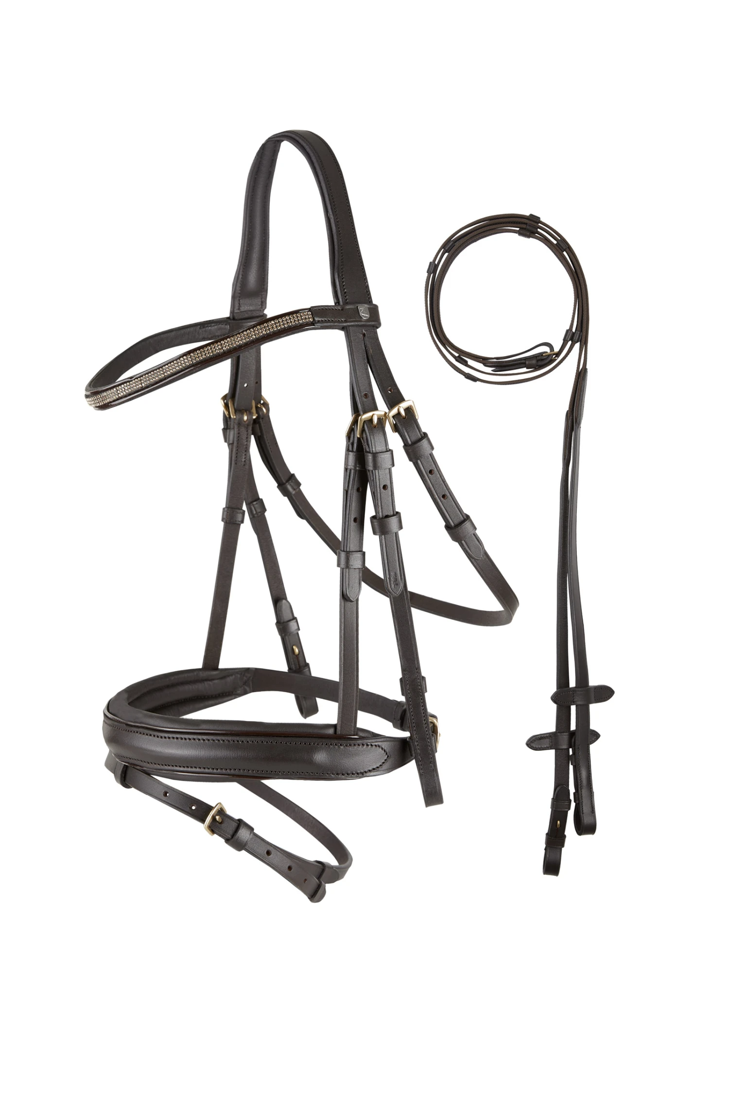 Der U-förmige, mit Kristallen eingefasste Stirnriemen, sorgt für elegantes Glitzern an dem fein gefertigten Zaumzeug.