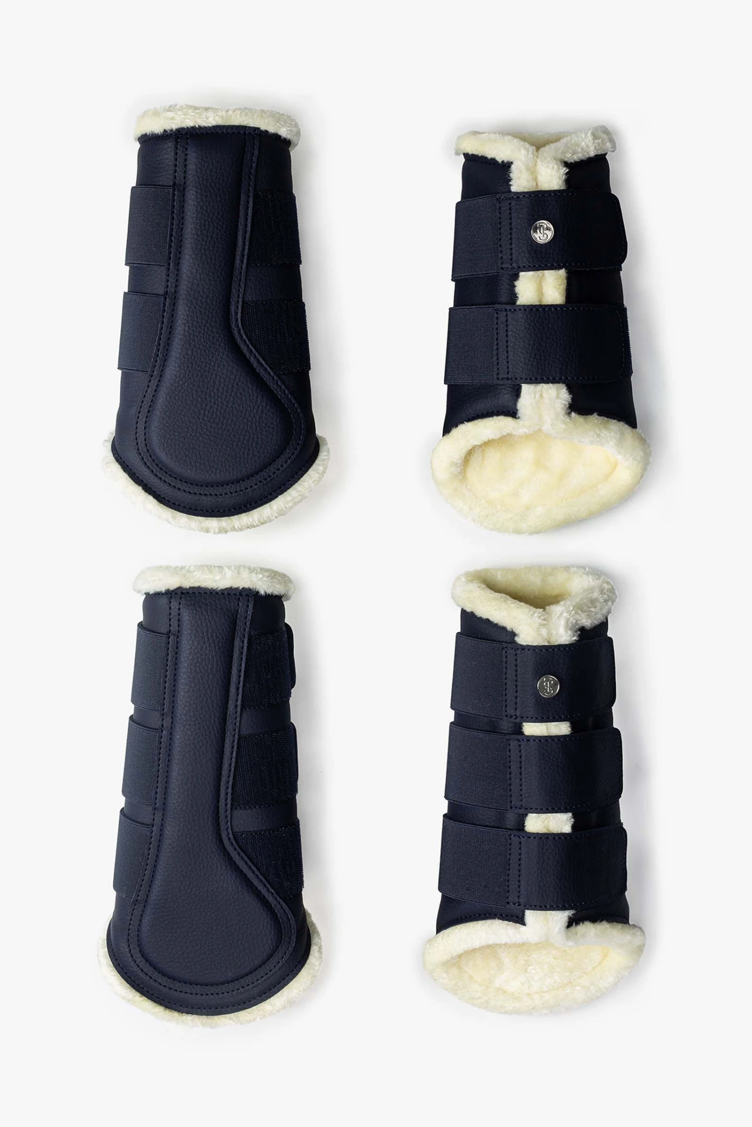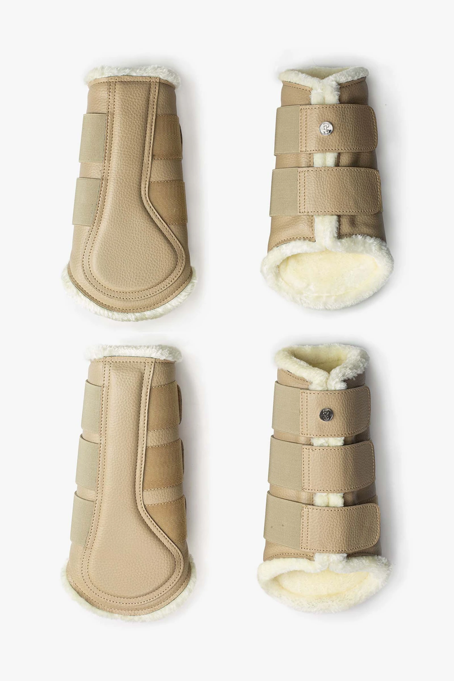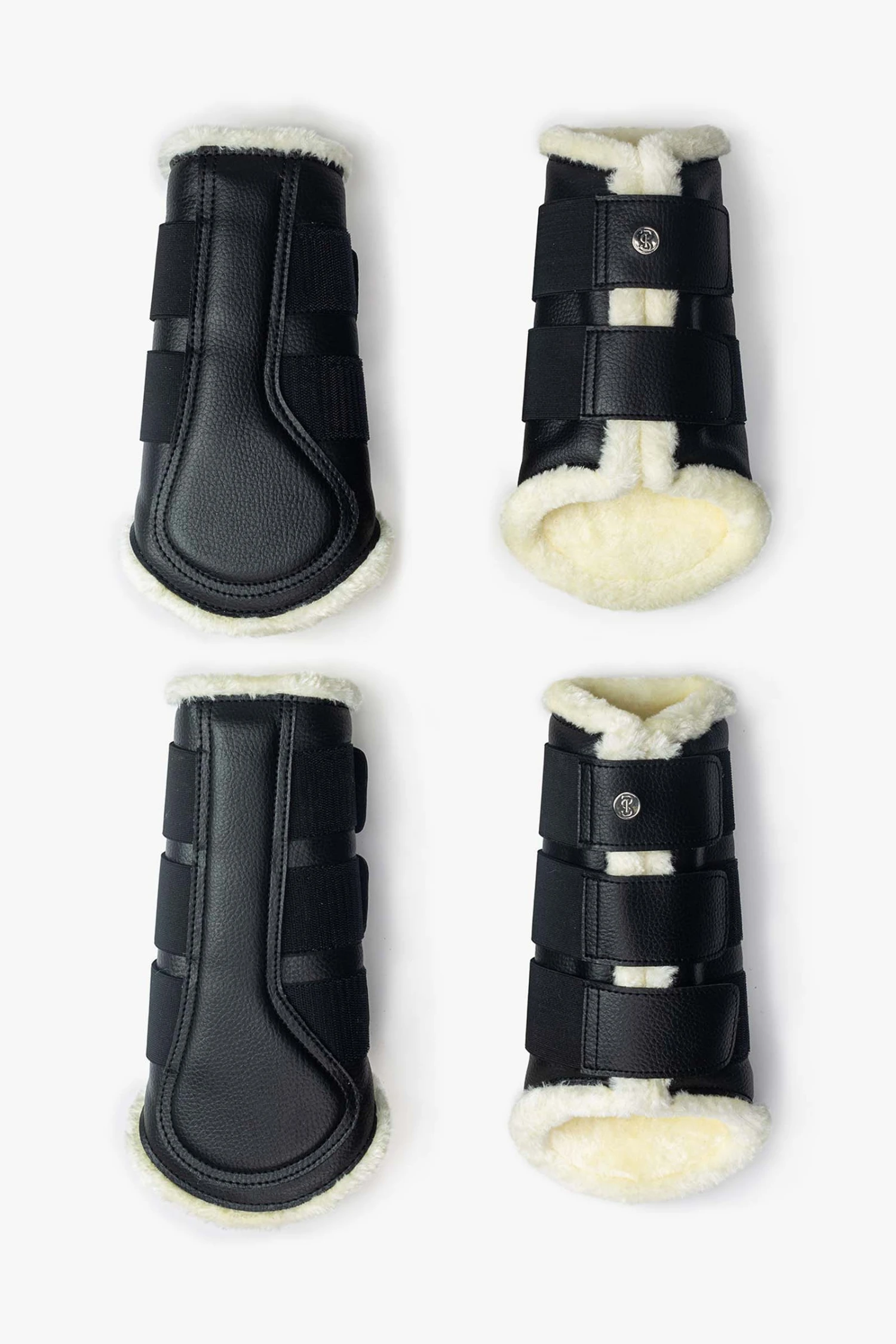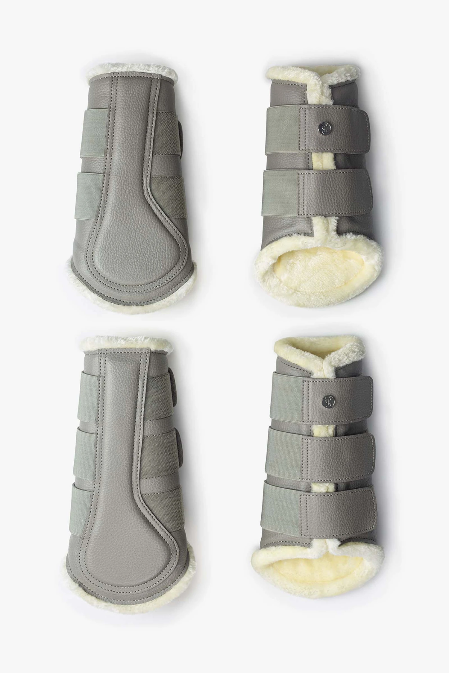 Gamaschen mit elastischen Klettverschlüssen. Die Gamaschen haben eine genarbte, vegane Lederoberfläche, ein extra Patch an der Innenseite des Beines für noch mehr Schutz und sind komplett mit weißem Kunstfell unterlegt. Die Gamaschen der Vorderbeine besitzen zwei Klettverschlüsse und die der Hinterbeine drei Klettverschlüsse – jede Gamasche ist verziert mit einem PS Logo Knopf.