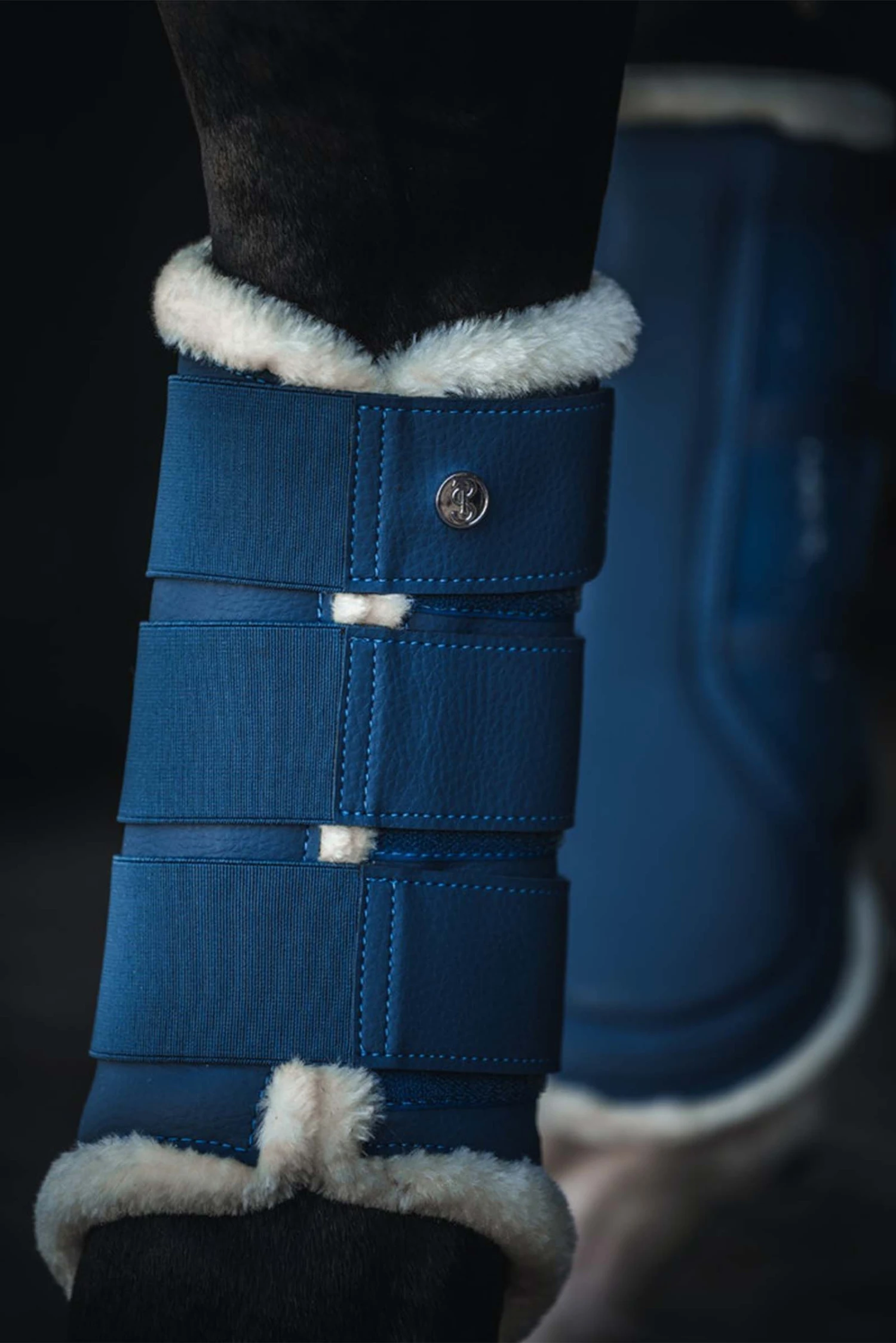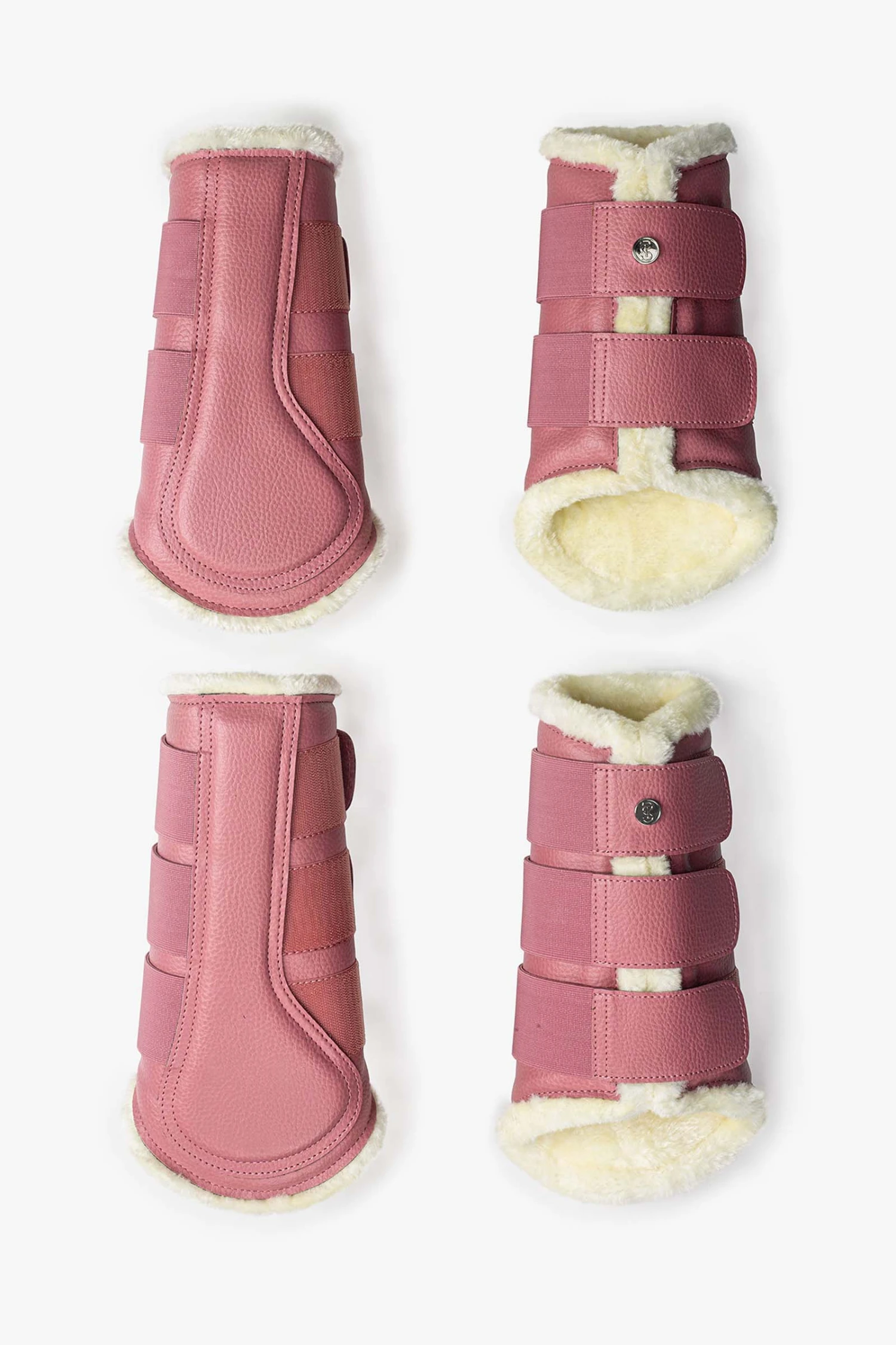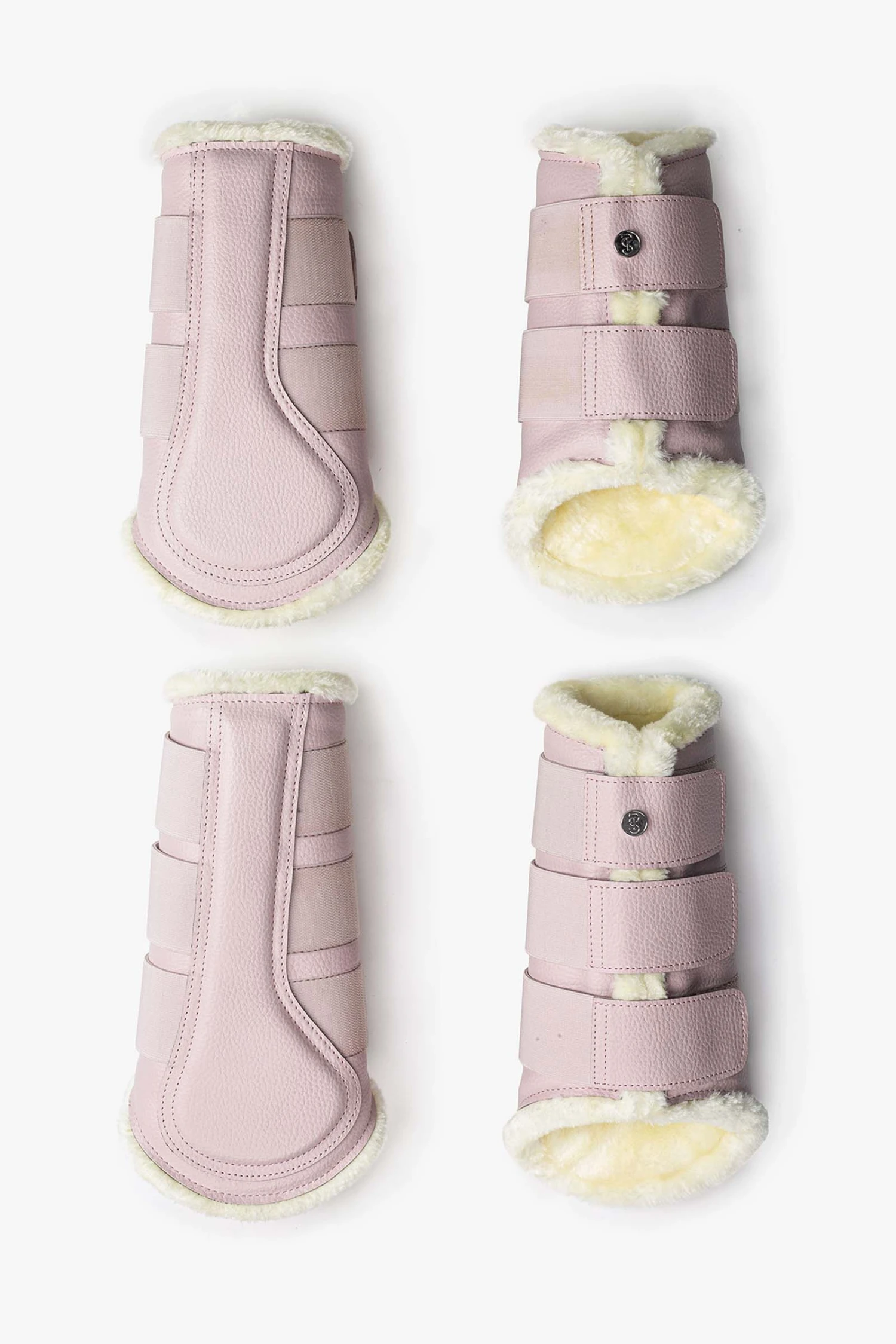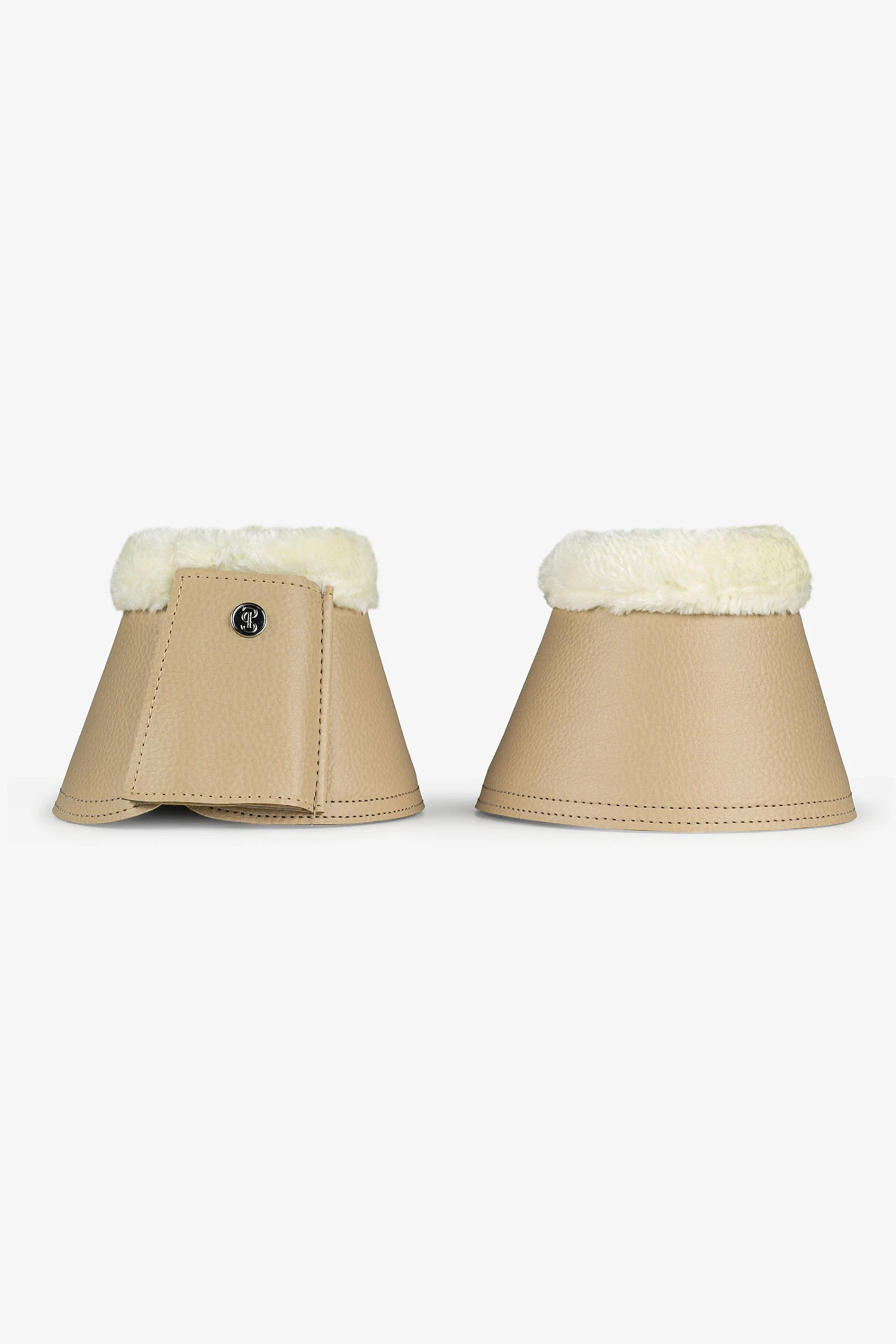 Gamaschen mit elastischen Klettverschlüssen. Die Gamaschen haben eine genarbte, vegane Lederoberfläche, ein extra Patch an der Innenseite des Beines für noch mehr Schutz und sind komplett mit weißem Kunstfell unterlegt. Die Gamaschen der Vorderbeine besitzen zwei Klettverschlüsse und die der Hinterbeine drei Klettverschlüsse – jede Gamasche ist verziert mit einem PS Logo Knopf.